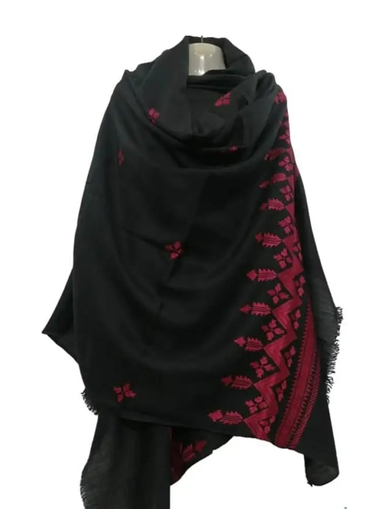 Our Black Swati shawl is a masterpiece of geometric artistry. Inspired by the rich cultural heritage of the Swat valley, this piece features bold, symmetrical embroidery in vibrant shades of pink and crimson. The intricate “pointed” patterns along the border are a hallmark of traditional Swati design, creating a regal look that stands out in any winter gathering.